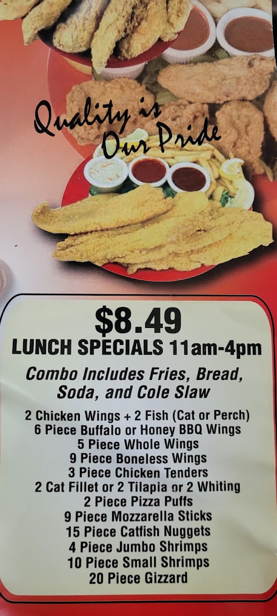 Your choice of 2 items: 3 catfish, 2 catfish fillet, 2 tilapia fillet, 3 jack salmon, 3 perch, 3 wings, 3 tenders or 10 shrimp.